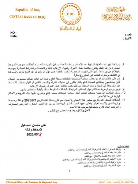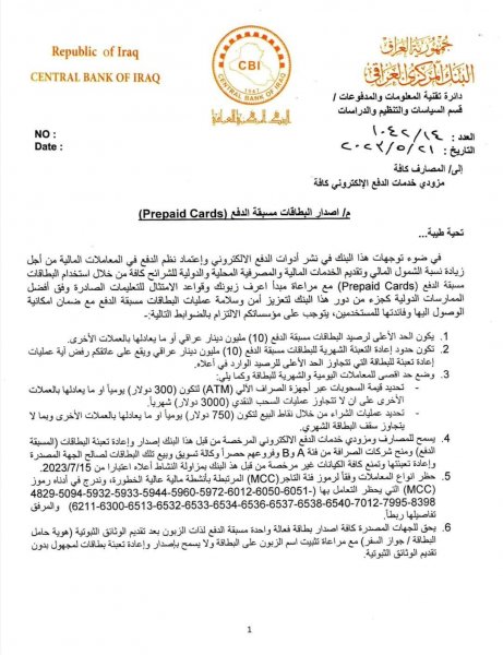 11- البطاقات الصادرة قبل تاريخ صدور هذا الإعمام ولا تحمل اسم تكون فعالة لغاية تاريخ 2023/8/1 أو نفاذ رصيدها أو أيهما أسبق، ولا تعاد تعبئتها وتطبق عليها الحدود المشار إليها في أعلاه ورموز فئة التاجر المذكورة آنفاً، وعلى المصارف والشركات اتخاذ اللازم باستبدالها بموجب هذا الإعمام![]()