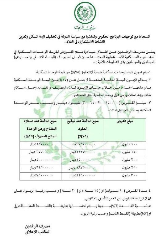 نشر مصرف الرافدين، تعليمات جديدة للقروض الخاصة بشراء الوحدات السكنية.وأدناه نص التعليمات: