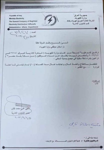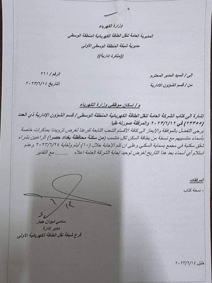 كشفت وثائق صادرة عن وزارة الكهرباء، حصلت عليها "تنوع نيوز" عن فتح باب التقديم للسكن في شقق بسماية، لموظفي الوزارة من سكنة بغداد حصراً. تفاصيل الوثائق في أدناه