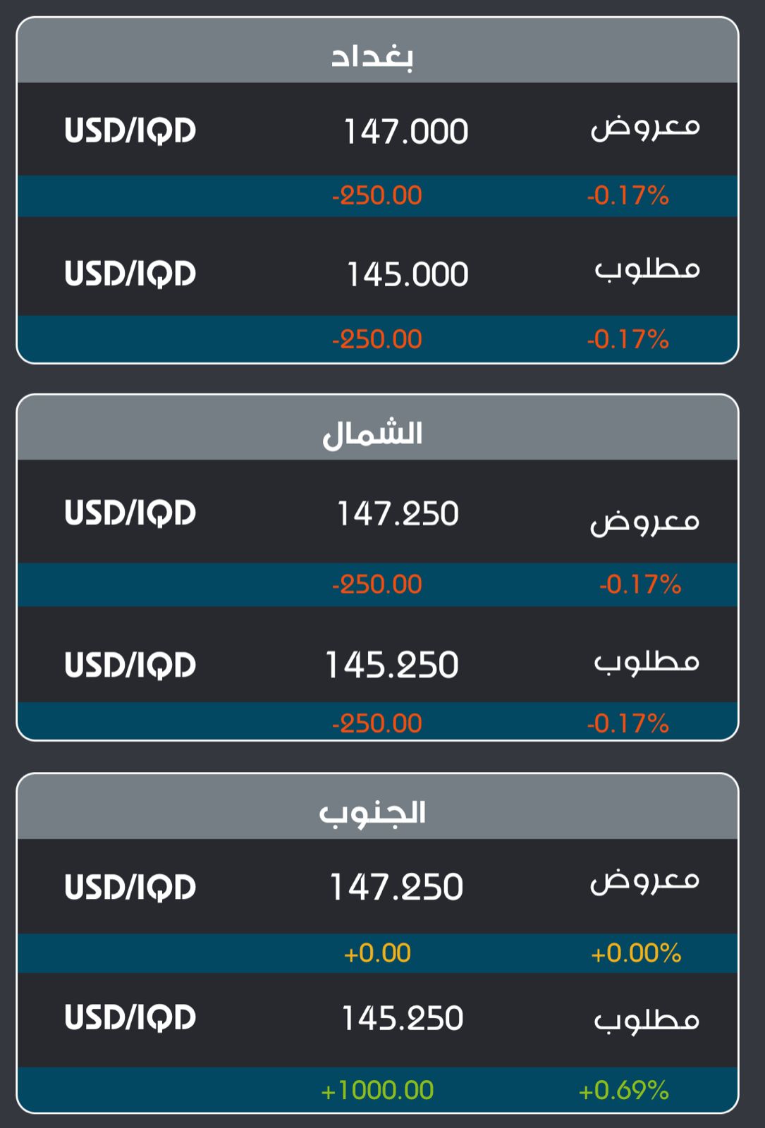 وقال مصدر مطلع ، إن "أسعار بيع وشراء الدولار شهدت انخفاضاً بمحال الصيرفة بالأسواق المحلية، إذ بلغ سعر البيع 147,000 دينار لكل 100 دولار، بينما بلغت أسعار الشراء 145,000 دينار لكل 100 دولار، في العاصمة بغداد".![]()