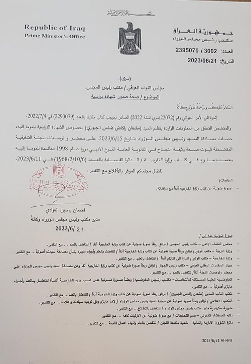 وقال مدير مكتب رئيس الوزراء احسان العوادي، في وثيقة موجهة الى مكتب رئيس البرلمان ، إنه "حصلت موافقة رئيس الوزراء محمد شياع السوداني بالمصادقة على صحة صدور شهادة مشعان الجبوري للمرحلة الاعدادية الفرع الادبي حسب كتاب وزارة الخارجية".