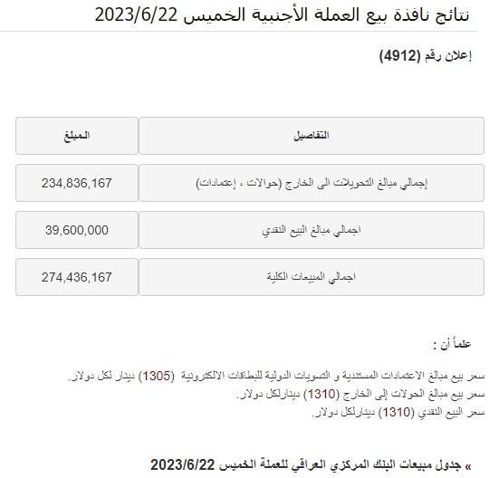 سجلت مبيعات البنك المركزي العراقي من الدولار في مزاد اليوم الخميس، استقرارا بلغ 300 مليون دولار.