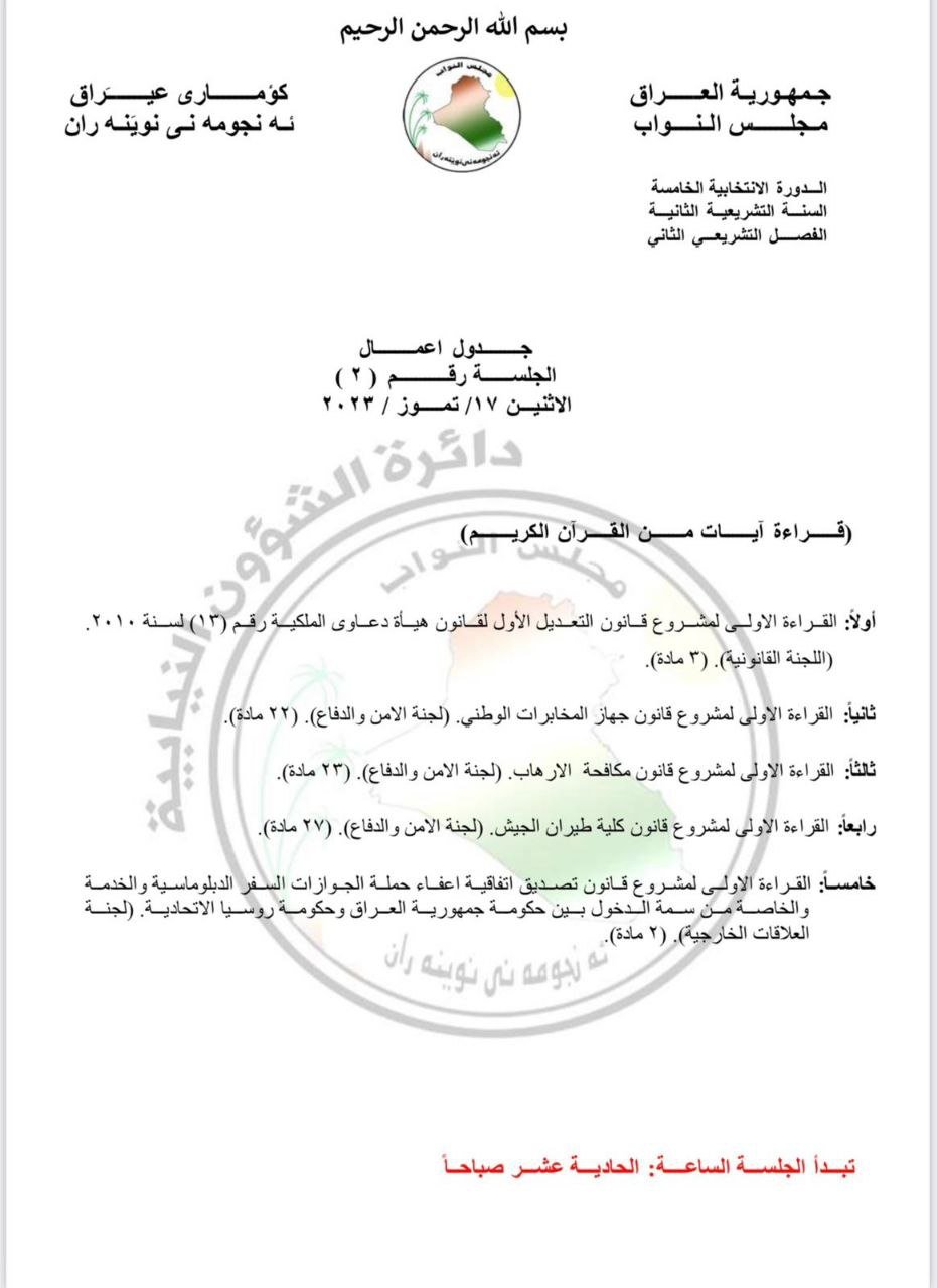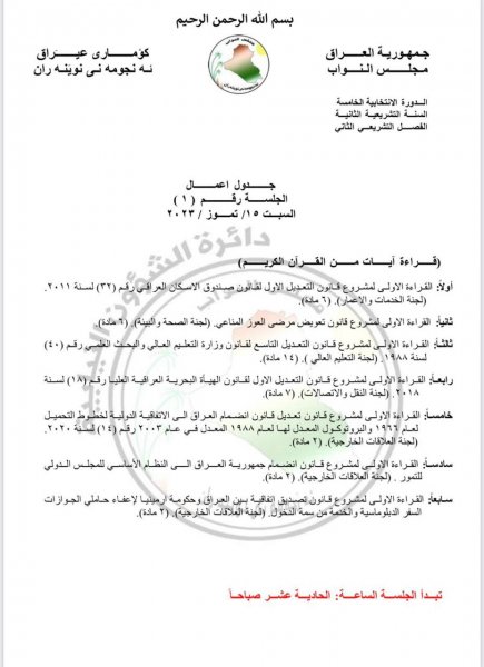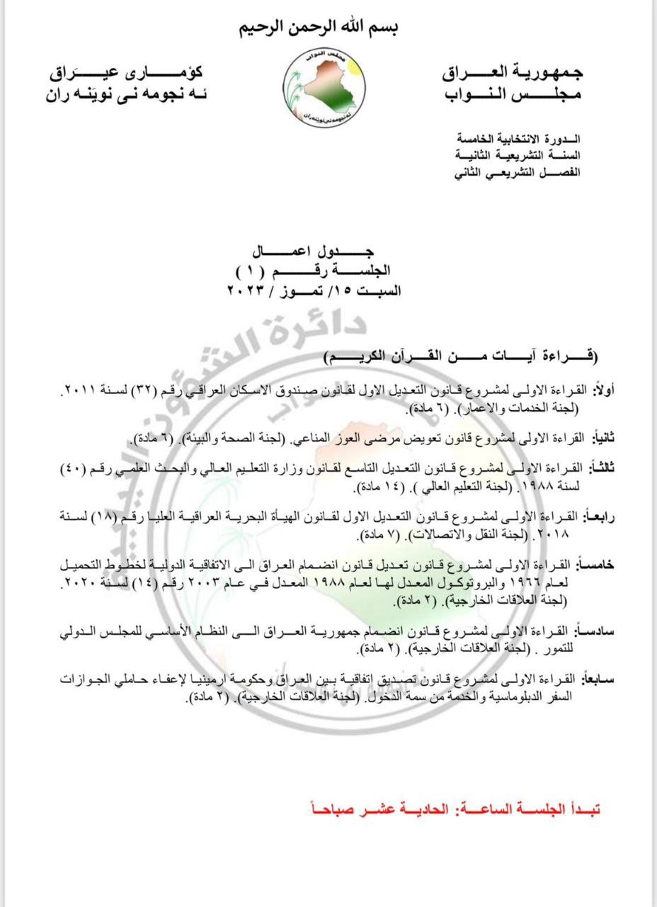 أعلنت الدائرة الإعلامية للبرلمان، عن جدولي أعمال جلستي مجلس النواب ليومي السبت والاثنين المقبلين.