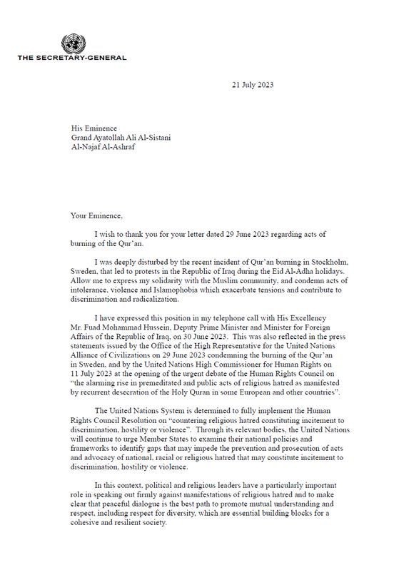 تنشر وكالة " تنوع نيوز" نص رسالة الأمين العام للأمم المتحدة أنطونيو غوتيريش إلى المرجع الديني الأعلى السيد السيد السيستاني بشأن حرق القرآن.