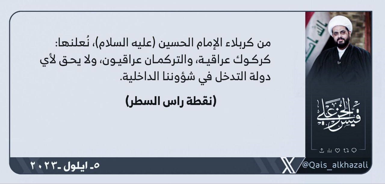 وقال الخزعلي في تغريدة تابعتها وكالة " تنوع نيوز": "كركوك عراقية والتركمان عراقيون ولا يحق لأي دولة التدخل في شؤونا الداخلية".