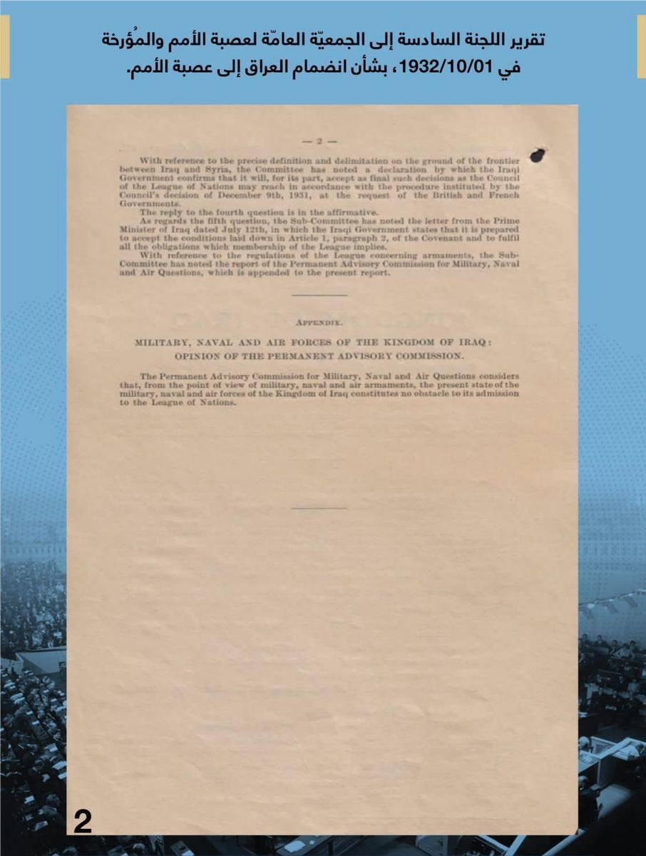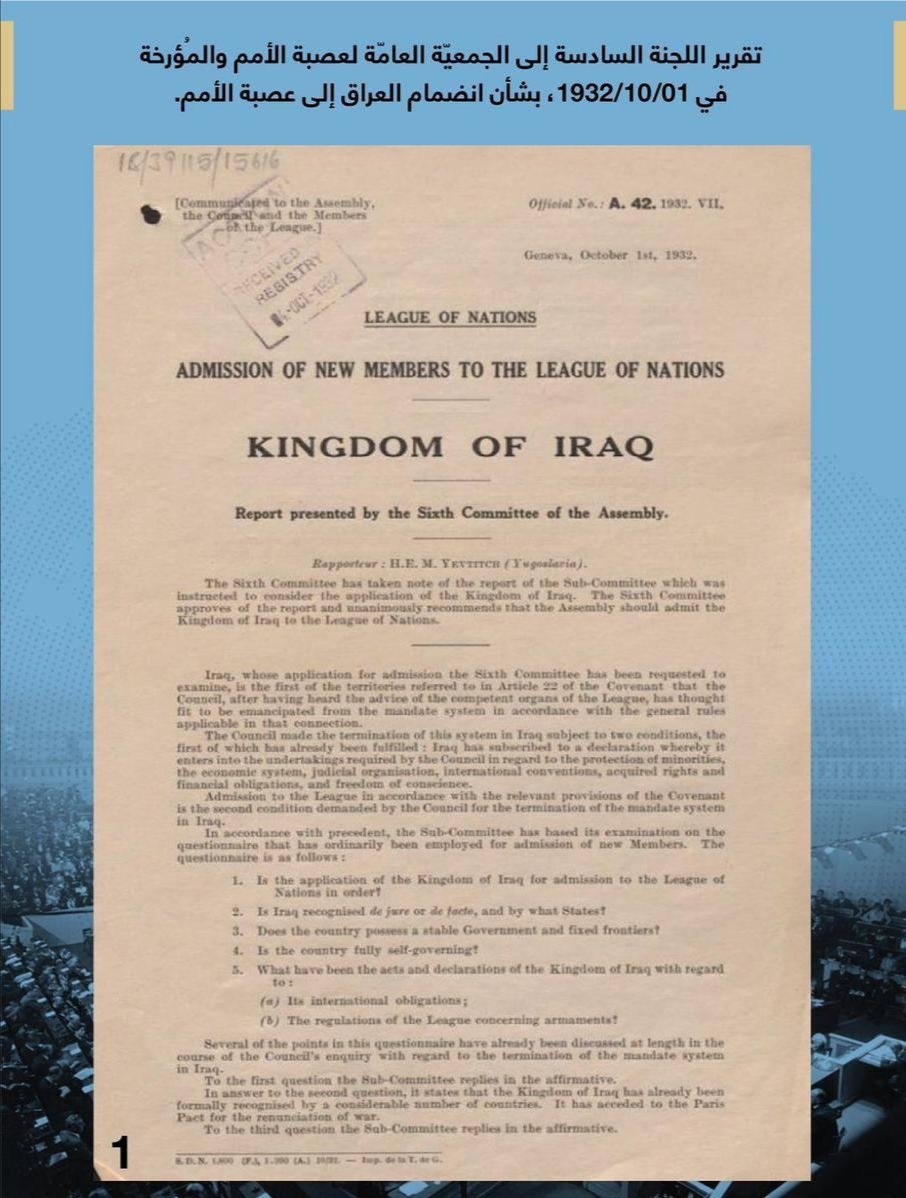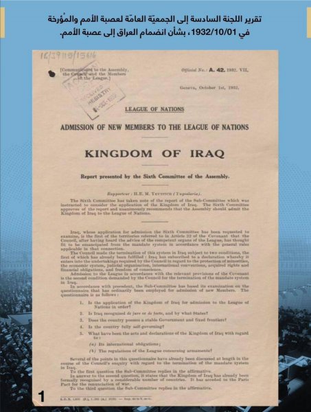 وبينت أنَّ "العراق كان أول دولة انضمت إلى عصبة الأمم بمُوجب المادة (22) من عهد عصبة الأمم الخاصة بالولاية والانتداب، بعد أن أصبح مؤهلاً للخروج من حالة الانتداب البريطانيّ التي وضع فيها بعد إنهيار الدولة العثمانيّة"![]()