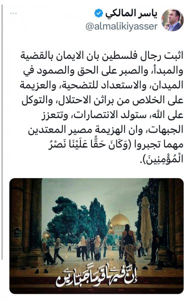 اثبت رجال فلسطين بان الايمان بالقضية والمبدأ، والصبر على الحق والصمود في الميدان، والاستعداد للتضحية، والعزيمة على الخلاص من براثن الاحتلال، والتوكل على الله، ستولد الانتصارات، وتتعزز الجبهات، وان الهزيمة مصير المعتدين مهما تجبروا (وَكَانَ حَقًّا عَلَيْنَا نَصْرُ الْمُؤْمِنِينَ).