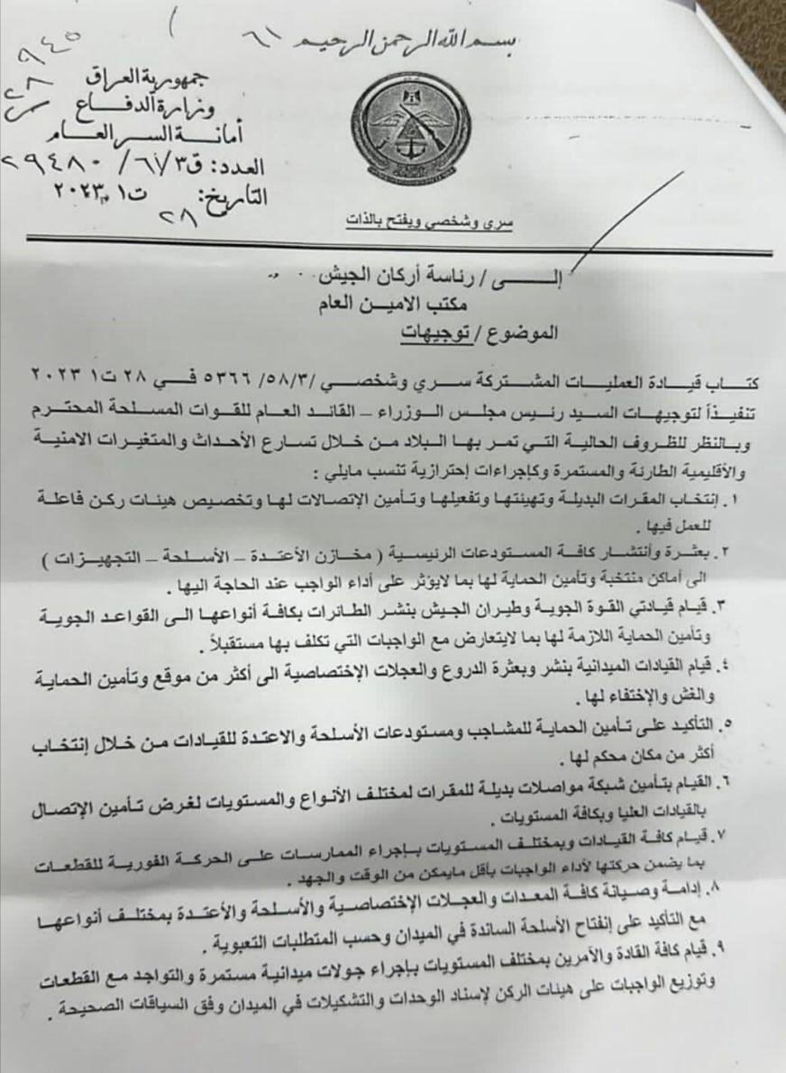 وجاء في الوثيقة المسربة، حصلت وكالة "تنوع نيوز" على نسخة منه سلسلة من التوجيهات، أبرزها توزيع الدبابات ونشر الطائرات والأسلحة العراقية، بالإضافة إلى تأمين شبكة مواصلات بديلة للمقرات، وحماية كافة المستودعات.