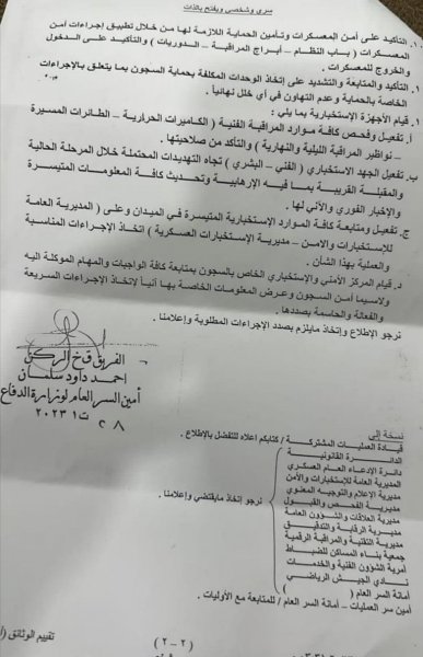 وشددت الأوامر على أمن السجون "وعدم التهاون مع أي خلل نهائياً".![]()