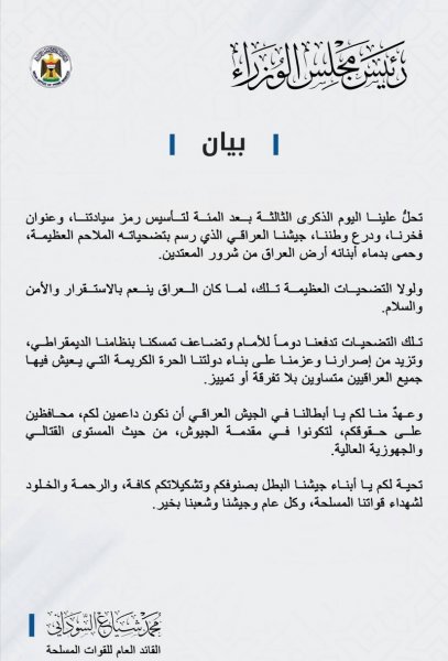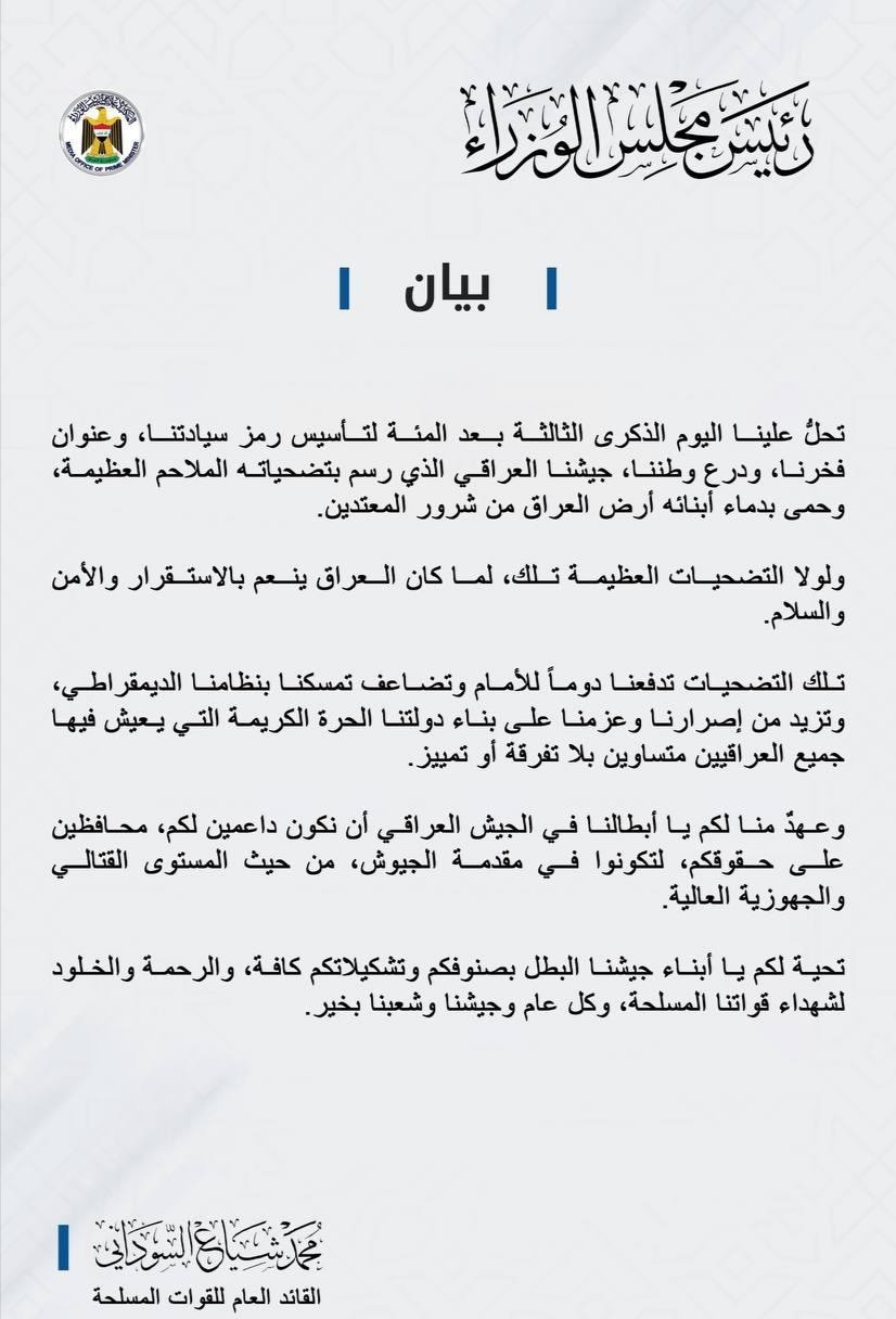 السوداني: الجيش العراقي رسم بتضحياته الملاحم العظيمة وحمى بدماء ابنائه الوطن