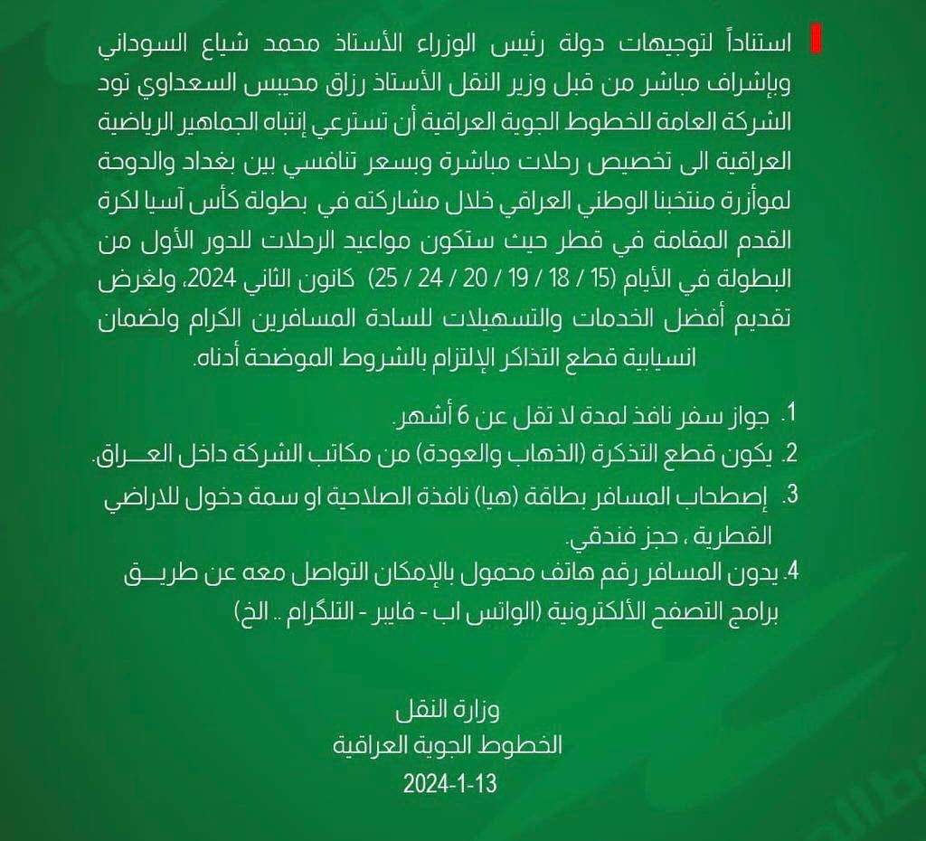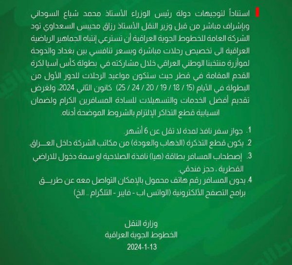 أعلنت وزارة النقل/ الخطوط الجوية العراقية، اليوم السبت ، مواعيد حجز الرحلات لمؤازرة المنتخب العراقي في قطر، فيما حددت الشروط.