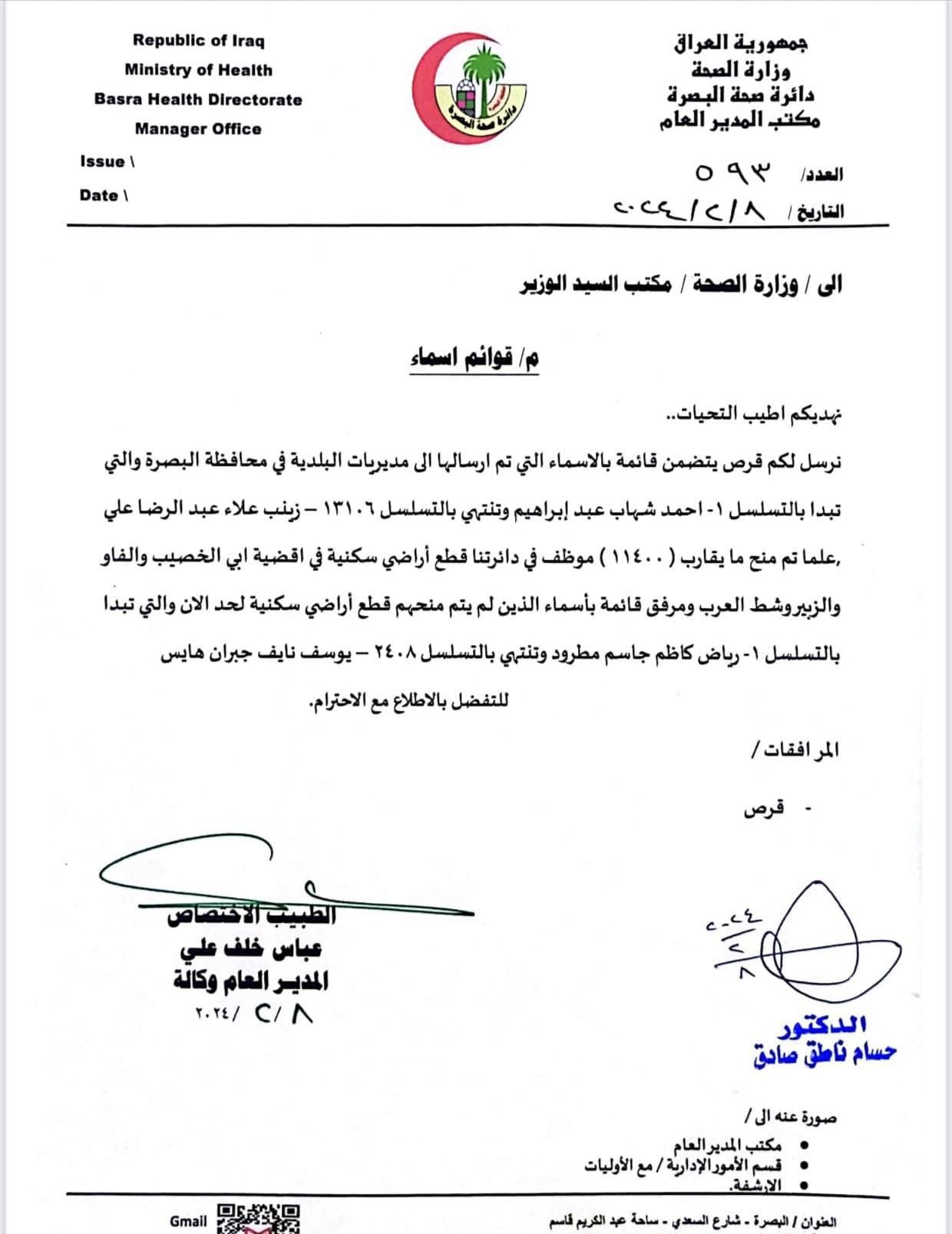 أعلنت وزارة الصحة صباح اليوم الجمعة عن أسماء الموظفين الذين تم رفع اسمائهم لوزارة الاعمار والاسكان لغرض الشمول بقطع الاراضي.