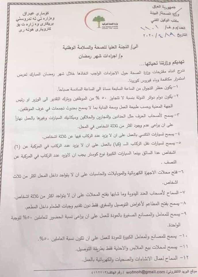 اقدمت وزارة الصحة على تقديم مجموعة من الاقترحات على اللجنة العليا على شكل لائحة إجراءات بخصوص شهر رمضان المباركة الواجبة اتباعها لغرض مكافحة وباء جائحة كورونا للعمل اثناء شهر رمضان المبارك وكالة تنوع نيوز