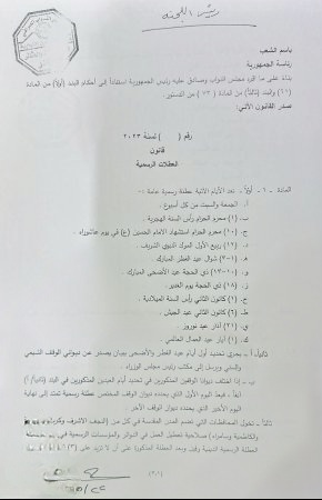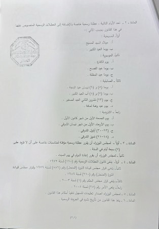 تنشر وكالة " تنوع نيوز " نص قانون العطلات الرسمية التي صوت عليها البرلمان بينها عطلة عيد الغدير.فيما يلي نص الوثيقة:
