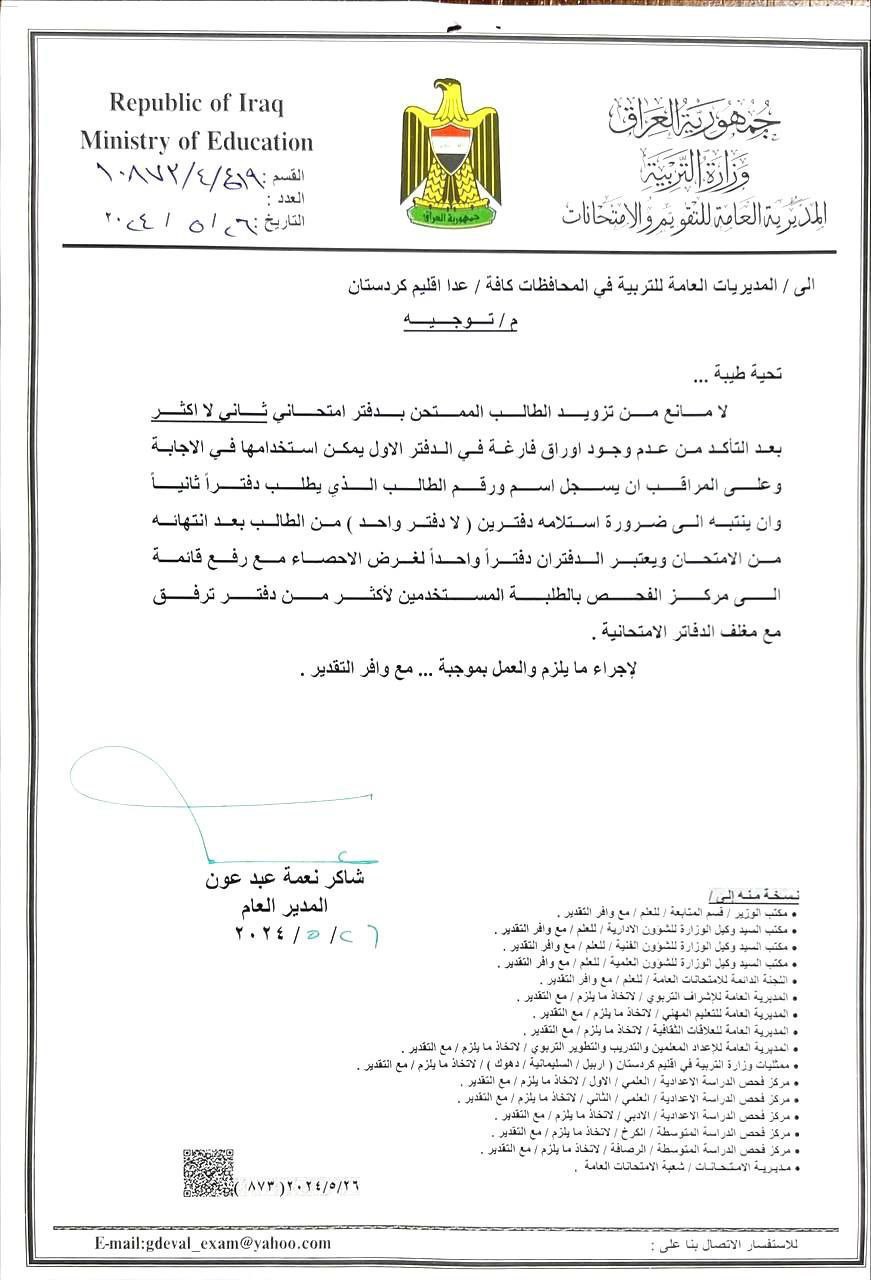 بالوثيقة.. التربية تسمح بتزويد الطالب الممتحن بدفتر امتحاني آخر