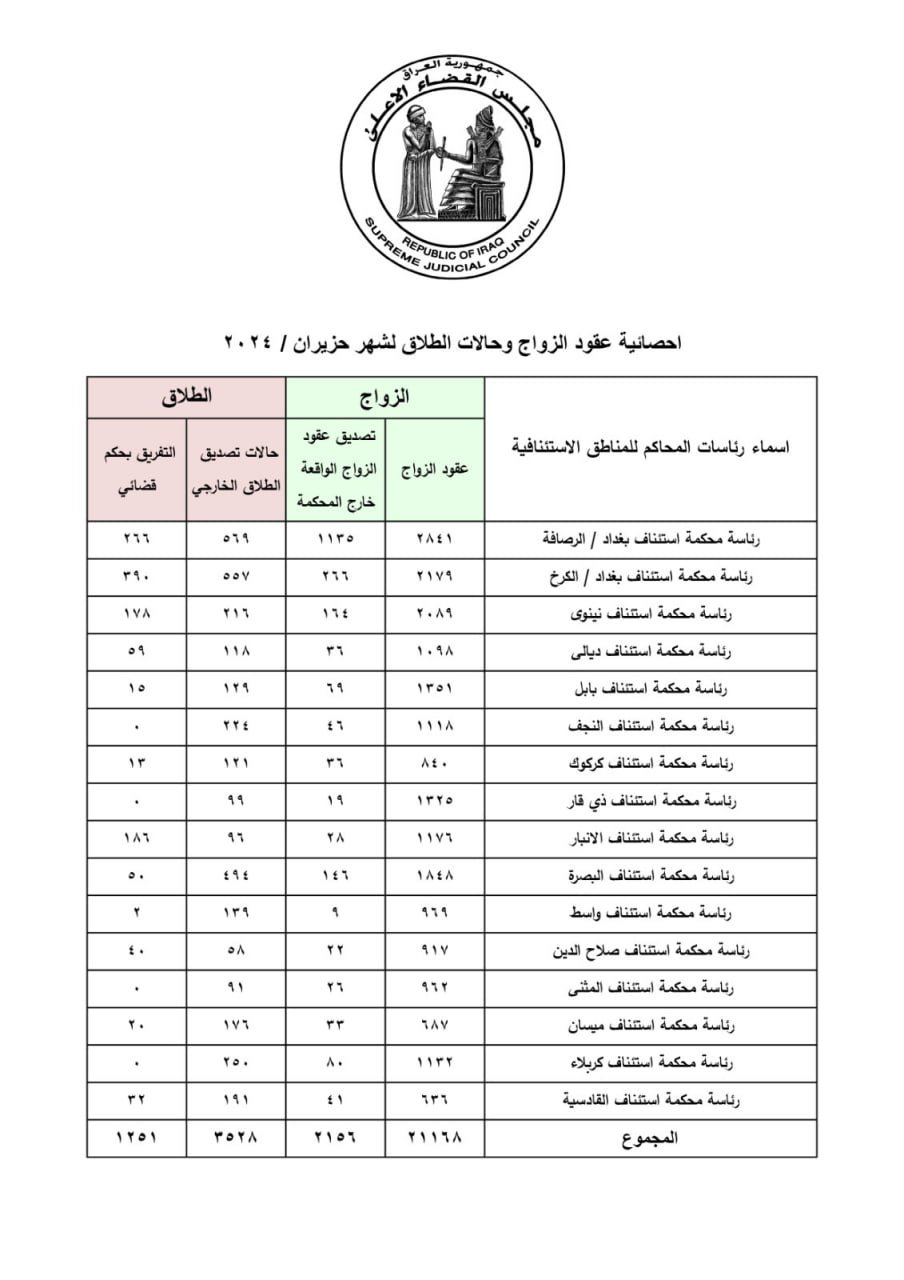 نشر مجلس القضاء الأعلى، اليوم الأحد، إحصائية بعدد حالات الزواج والطلاق لشهر حزيران الماضي.