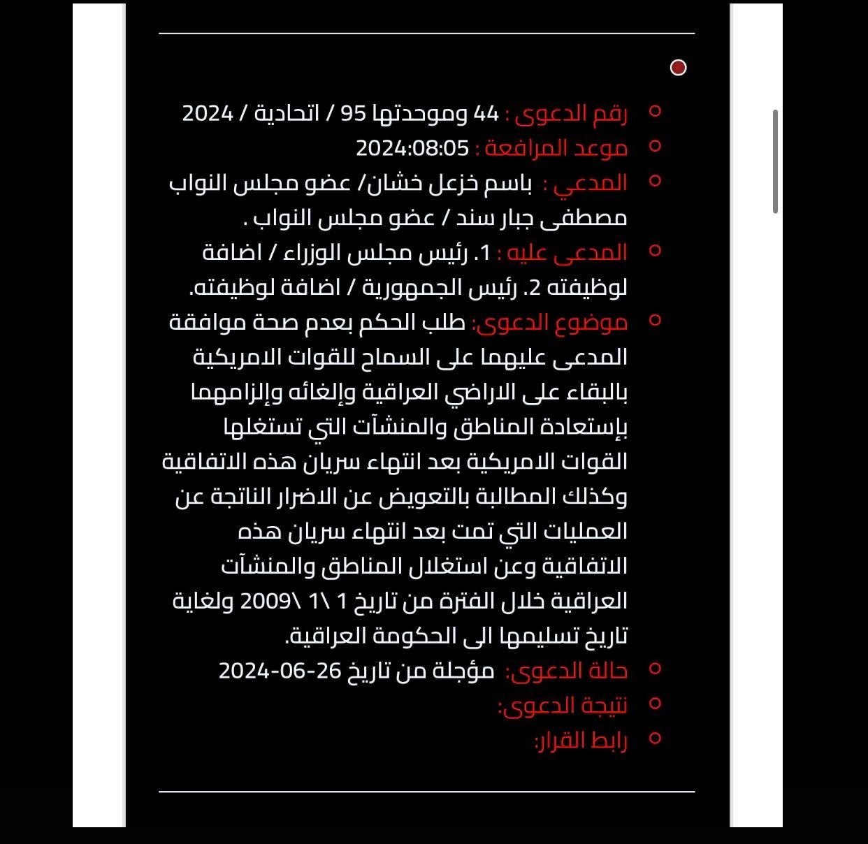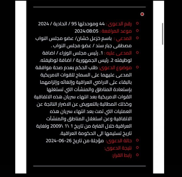 قررت المحكمة الاتحادية العليا، اليوم الاثنين ، رد الدعوى بشأن بقاء القوات الأمريكية في العراق لعدم الاختصاص
