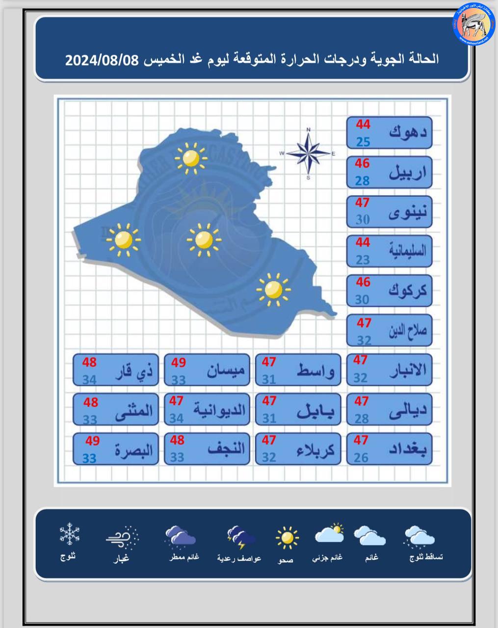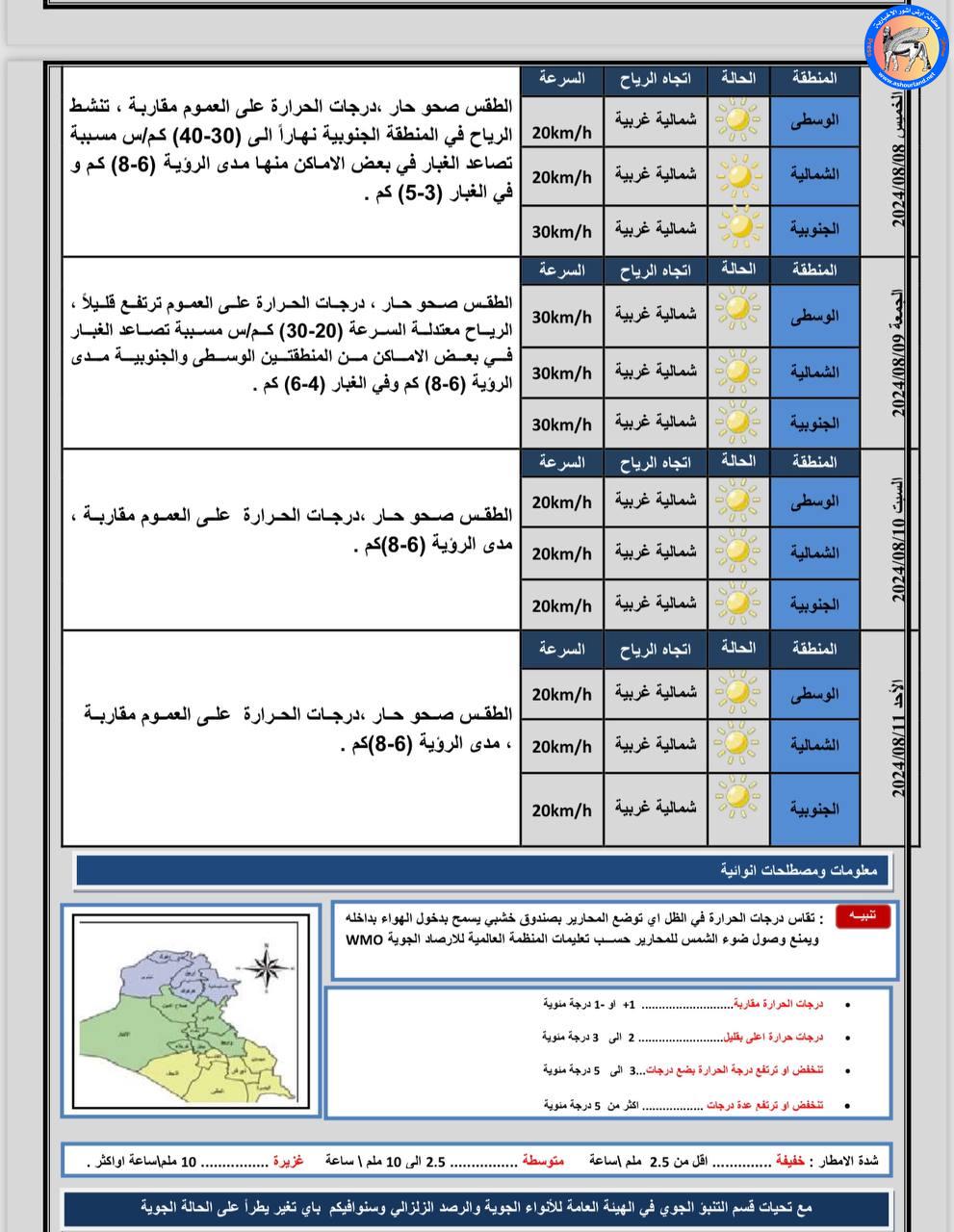 وذكر بيان لإعلام وزارة النقل، تلقته وكالة " تنوع نيوز"، ان” النشرة الجوية اليوم الاربعاء الموافق ٧/ آب والايام التي تليه والصادرة عن الهيئة العامة للانواء الجوية والرصد الزلزالي