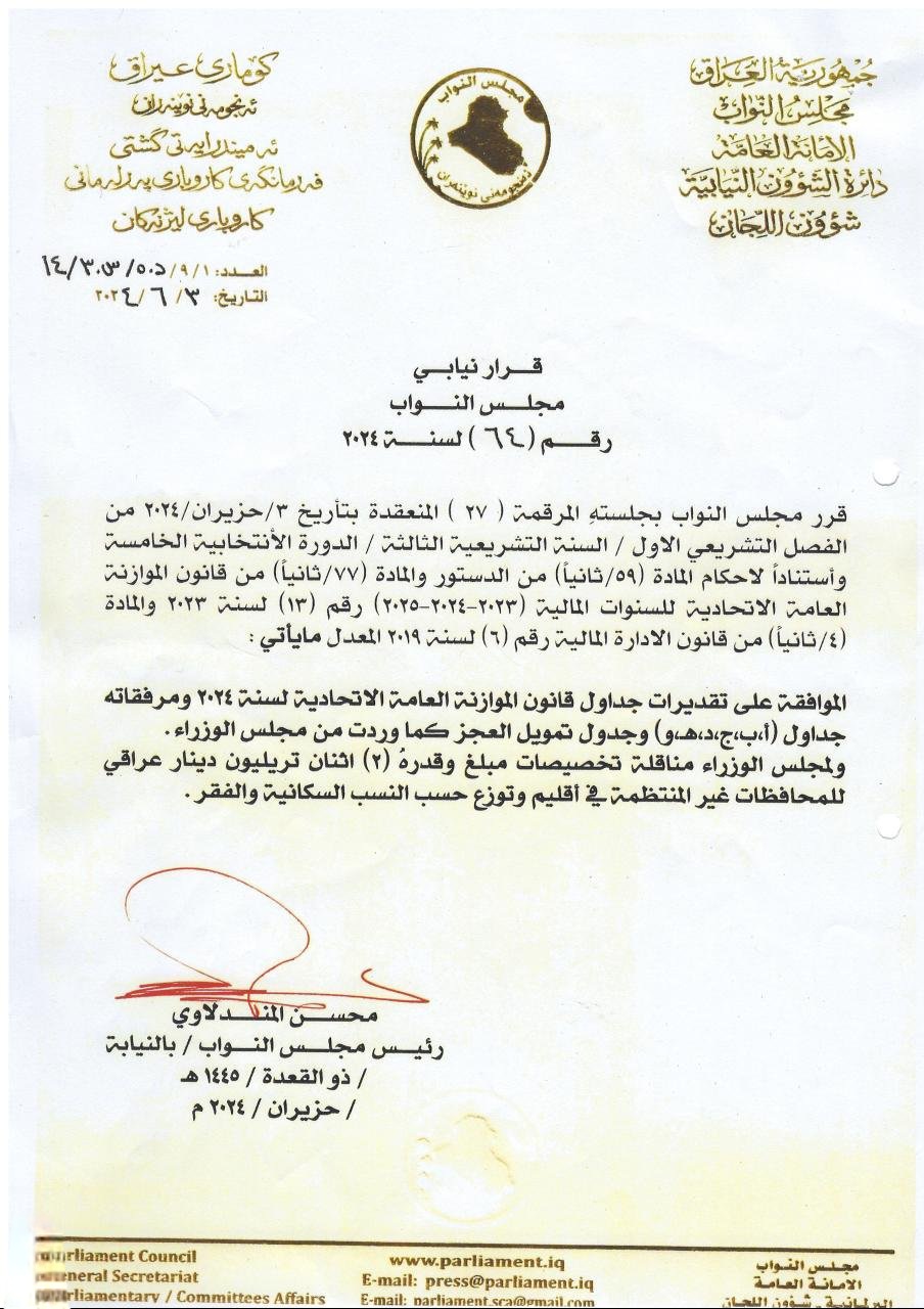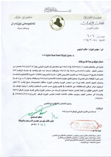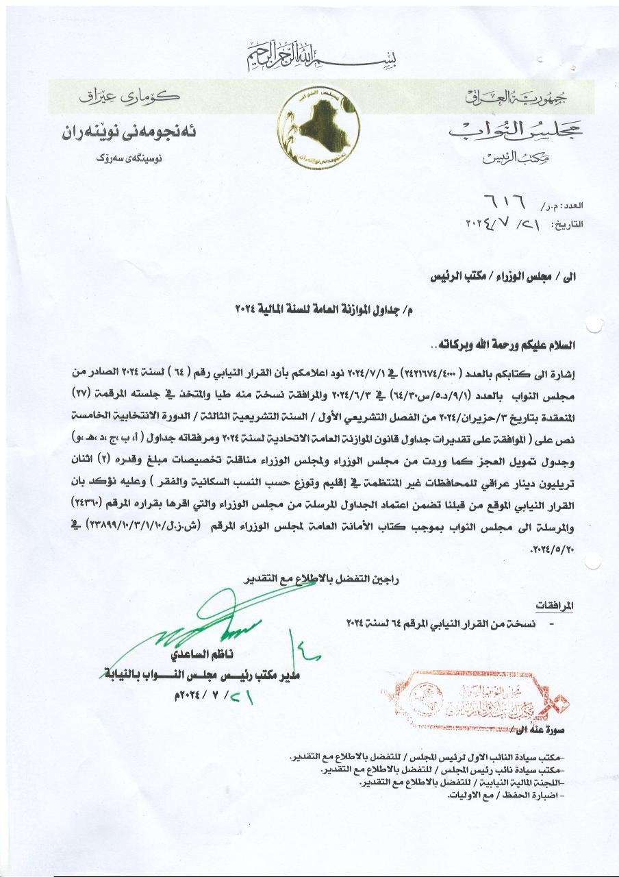 وتابع، "بهدف التأكيد على عدم اعتماد أي نسخة معدلة، عاودنا إصدار كتاب من مجلس النواب / مكتب الرئيس ذي الرقم (616) في 21/7/2024 والمرفق صورة عنه، والمرسل إلى مجلس الوزراء / مكتب الرئيس , والذي أشار و بكل وضوح إلى ( الموافقة على تقديرات جداول قانون الموازنة ومرفقاته من الجداول المذكورة أعلاه مع جدول تمويل العجز المذكور آنفاً وكذلك حق المناقلة بنفس المبلغ المثبت وهو (2) تريليون"، مشيرا إلى، "فقرة تضمنها ذات الكتاب تؤكد وبكل وضوح على (أن القرار النيابي تضمن اعتماد الجداول المرسلة من مجلس الوزراء والتي جرى إقرارها في الجلسة المنعقدة دون أي إضافات)".