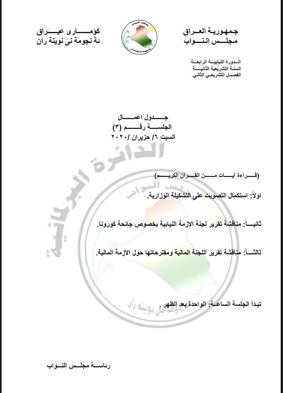 وأظهرت وثيقة تضمنت جدول أعمال المجلس ليوم السبت، استكمال التصويت على التشكيلة الوزارية، ومناقشة تقرير لجنة الأزمة النيابية بخصوص جائحة كورونا.