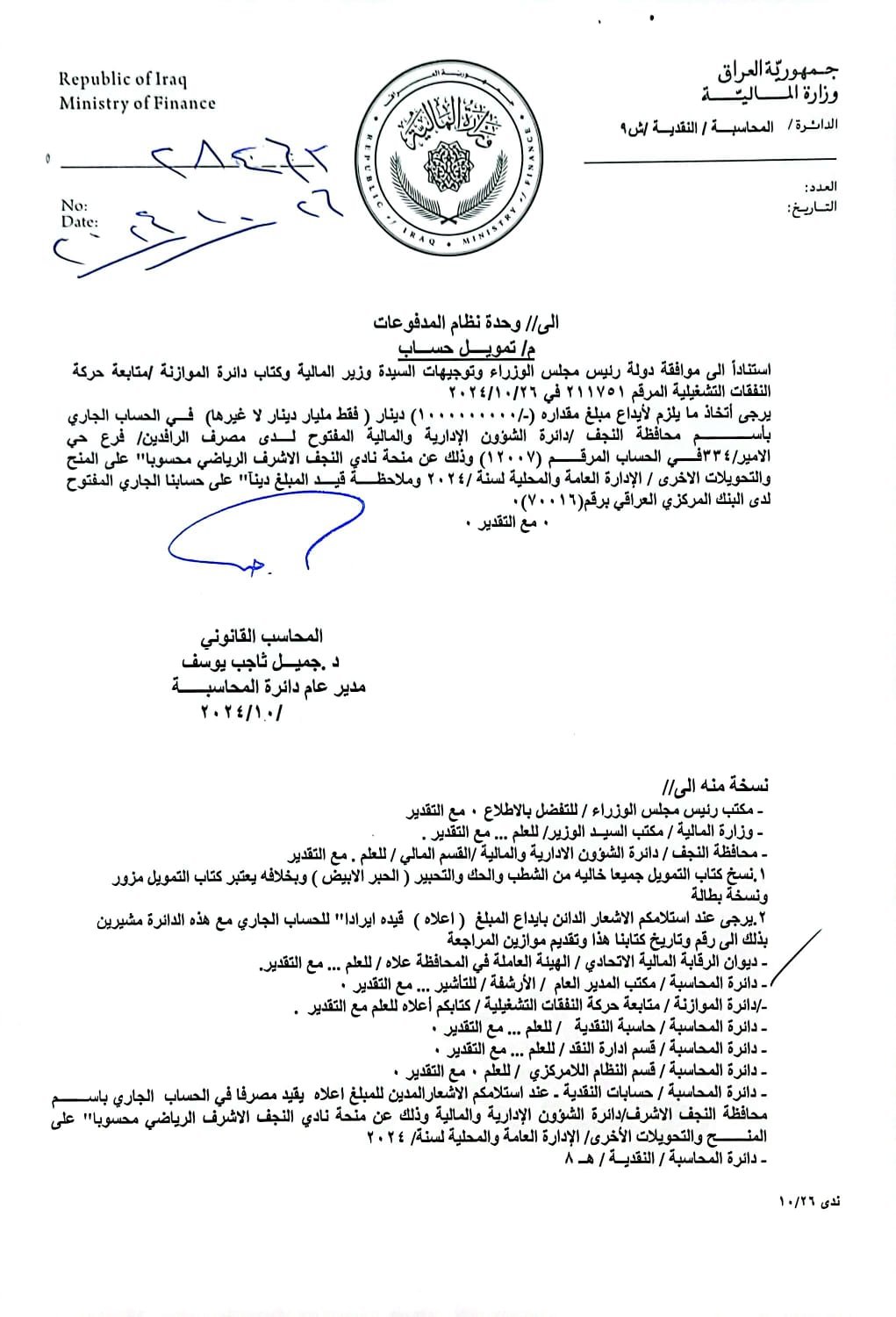 أعلنت وزارة المالية، اليوم السبت، تمويل نادي النجف الرياضي بمبلغ مليار دينار