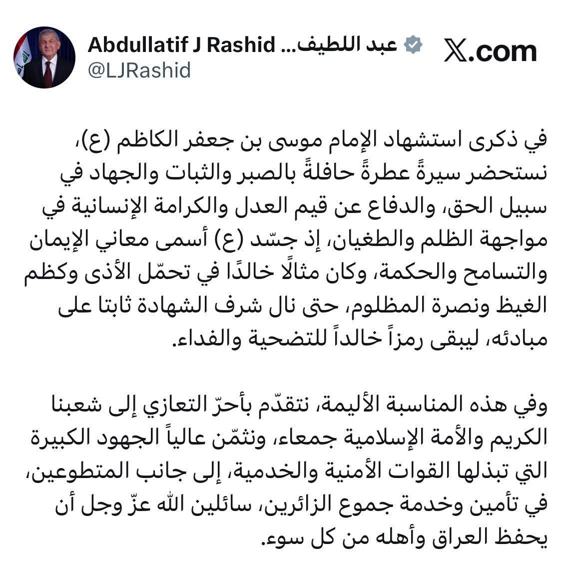 رئيس الجمهورية ينعى ذكرى استشهاد الإمام موسى الكاظم (ع) ويؤكد على قيم الصبر والعدالة