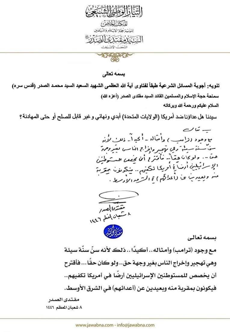في تصريح مثير للجدل، دعا زعيم التيار الصدري، مقتدى الصدر، الرئيس الأمريكي دونالد ترامب إلى تخصيص أرض للإسرائيليين داخل الولايات المتحدة. وأكد الصدر أن العداء لإسرائيل سيكون أبديًا، مشددًا على رفض أي تسوية أو تطبيع مع الدولة العبرية.