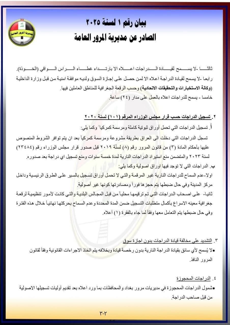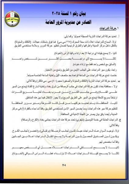 ويأتي هذا البيان في إطار الجهود المستمرة لتعزيز السلامة المرورية والحد من الحوادث الناجمة عن عدم الالتزام بقوانين السير، خاصة مع تزايد استخدام الدراجات النارية في مختلف المدن العراقية.