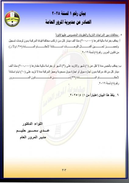 وشددت المديرية على ضرورة تسجيل جميع الدراجات النارية لدى الجهات المختصة، مع الالتزام بالضوابط القانونية المعمول بها، مشيرة إلى أن المخالفين سيتعرضون لعقوبات قانونية تشمل الغرامات وحجز الدراجات غير المسجلة.