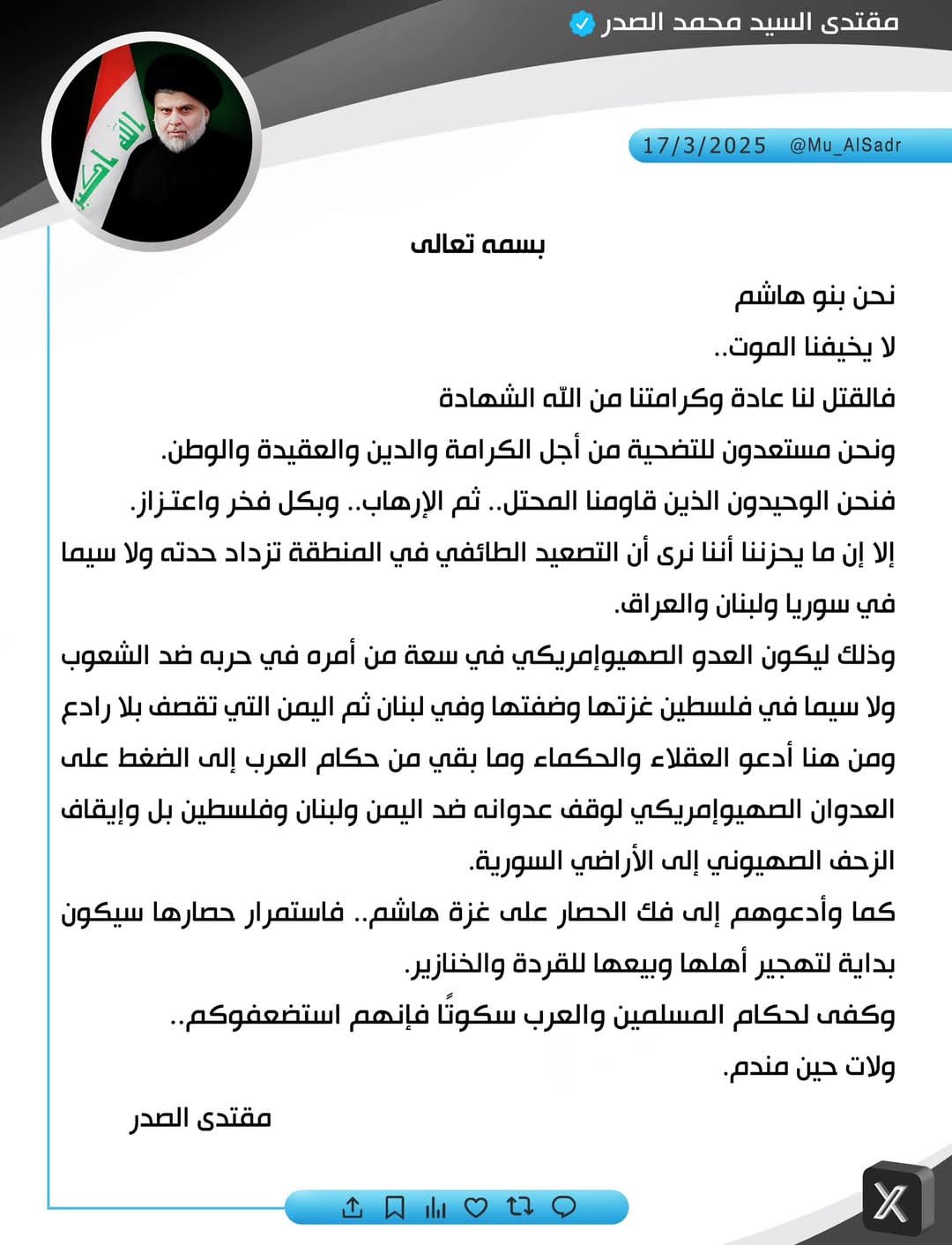 نشر السيد مقتدى الصدر، بيانًا عبر حسابه الرسمي على منصة "إكس" بمناسبة ذكرى ضربة الإمام علي بن أبي طالب (عليه السلام).