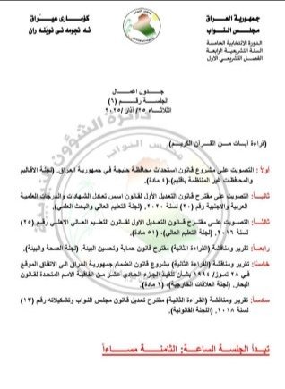 أعلن مجلس النواب، عن جدول اعماله لجلسة يوم غد الثلاثاء.وذكرت الدائرة الإعلامية لمجلس النواب في بيان تلقته وكالة "تنوع نيوز" : أن "جدول اعمال جلسة يوم غد الثلاثاء تضمن 6 فقرات،وفيما يلي نص الجدول: