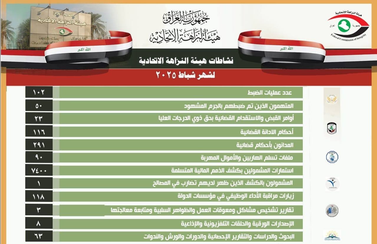 أعلنت هيئة النزاهة الاتحادية، اليوم الجمعة، عن نشاطاتها خلال شهر شباط الماضي، مشيرةً إلى صدور 23 أمر ضبط واستقدام بحق ذوي درجات عليا.