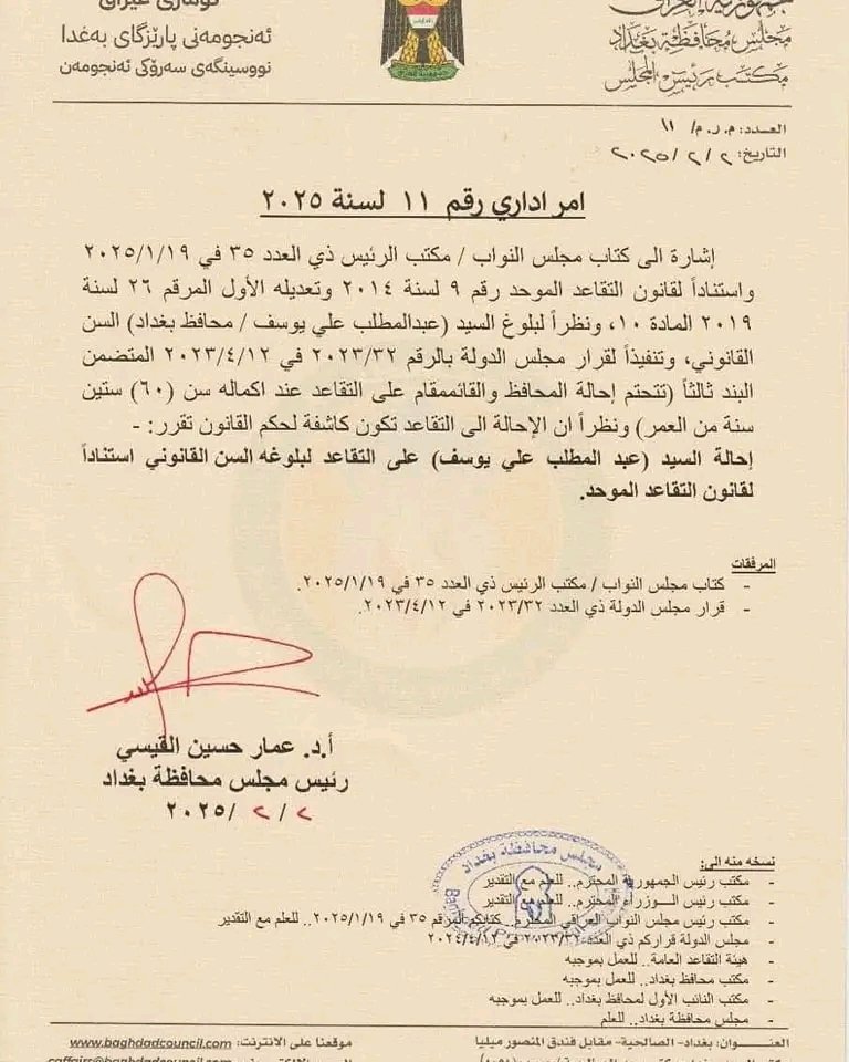 وجّه محافظ بغداد، عبد المطلب العلوي، اليوم الثلاثاء، بإجراء جرد دقيق وتوثيق شامل لجميع الأملاك والعقارات العائدة للمحافظة، مع التأكيد على ضرورة اتخاذ الإجراءات القانونية والإدارية اللازمة لإزالة هذه التجاوزات.