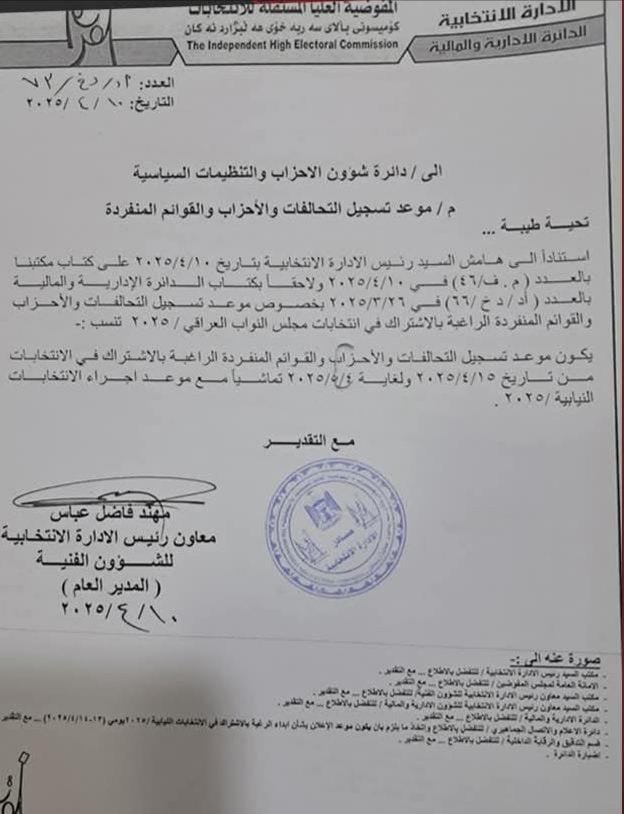 وحسب وثيقة اطلعت عليها وكالة "تنوع نيوز" فإن "موعد تسجيل التحالفات والأحزاب والقوائم المنفردة الراغبة بالاشتراك بالانتخابات سيكون يوم 15 من الشهر الجاري ولغاية يوم 4 من شهر أيار المقبل. ![]()
