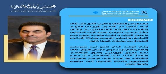 هنأ محسن المندلاوي النائب الأول لرئيس مجلس النواب ابناء المكون الإيزيدي الكريم بمناسبة حلول رأس السنة الايزيدية .