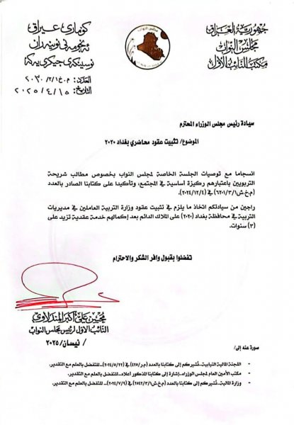 وذكر المكتب الإعلامي للنائب الأول لرئيس مجلس النواب في بيان، تلقته وكالة "تنوع نيوز" "في إطار متابعته الشخصية لحقوق شريحة التربويين بما يضمن تنفيذها، طالب النائب الأول لرئيس مجلس النواب محسن المندلاوي، مجلس الوزراء وبشكل رسمي، بتثبيت عقود محاضري وزارة التربية العاملين في مديريات بغداد لعام 2020 على الملاك الدائم، بعد إكمالهم أكثر من ثلاث سنوات من الخدمة العقدية".