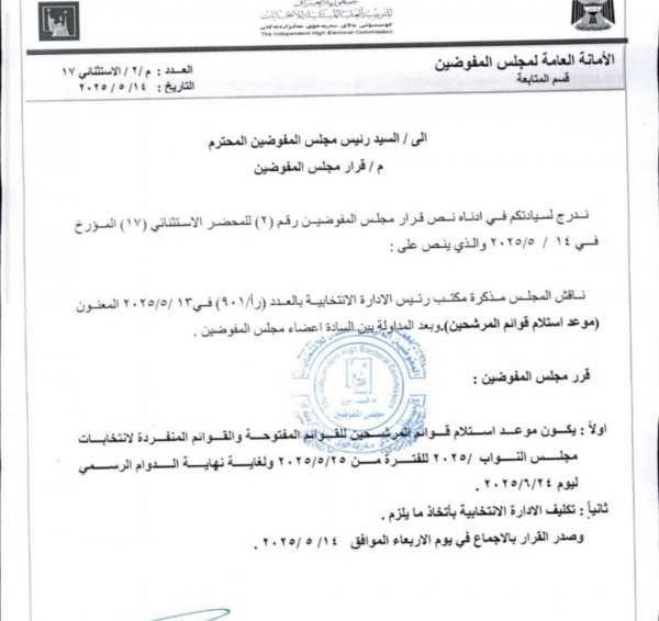 حددت مفوضية الانتخابات، موعد استلام قوائم المرشحين للانتخابات النيابية المقبلة.وبحسب وثيقة صادرة من المفوضية، فانه"سيتم بدء استلام القوائم اعتبارا من 25 أيار الجاري ولغاية 24 حزيران المقبل.