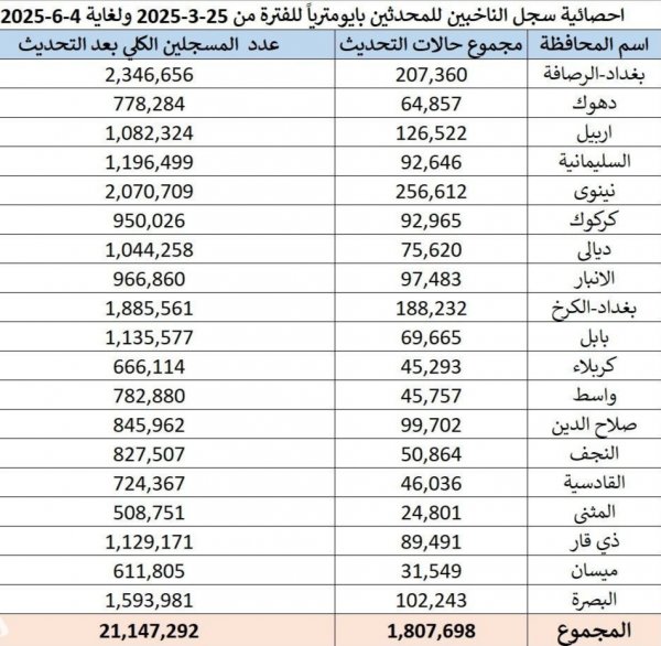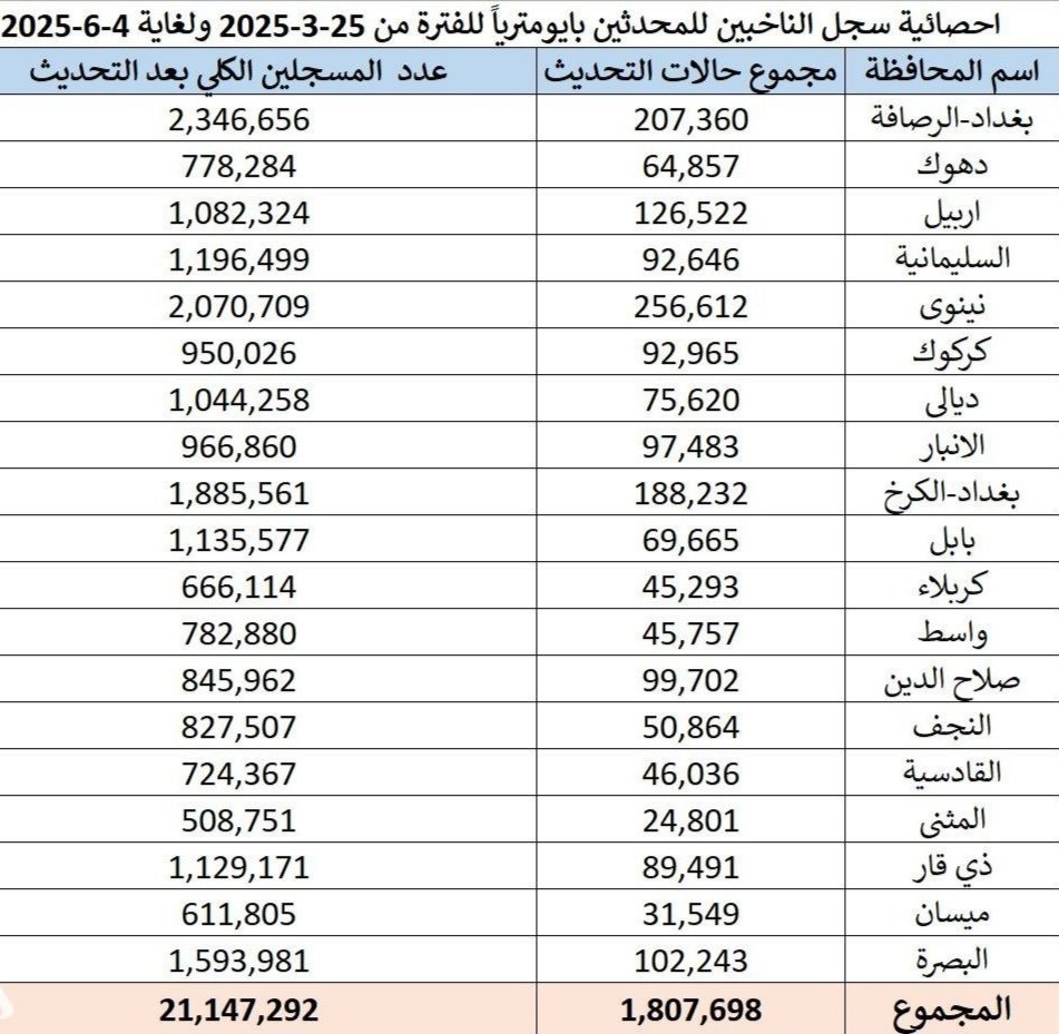 وذكر بيان للمفوضية تلقته وكالة "تنوع نيوز" أن "عدد المسجلين بايومترياً الكلي بعد التحديث، بلغ 21.147.292 ناخباً".