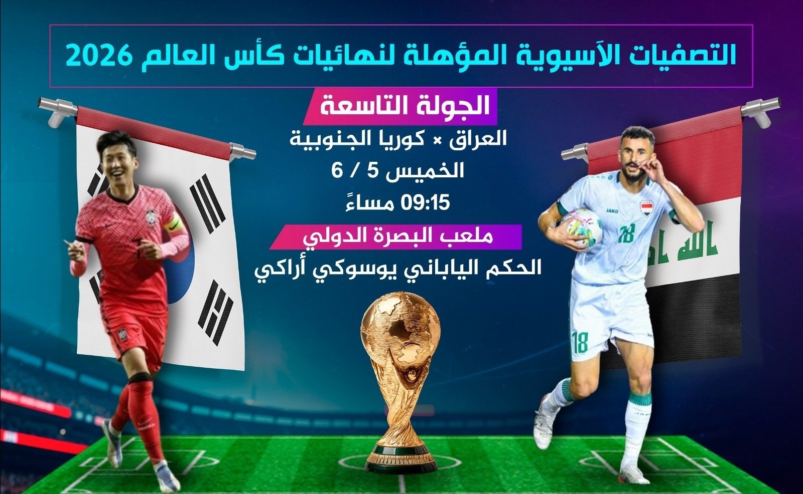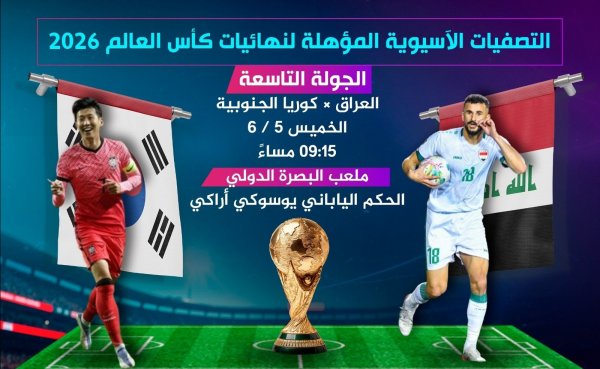 يترقب عشاق الكرة العراقية، مواجهة نارية يخوضها منتخبنا الوطني لكرة القدم في تمام الساعة التاسعة والربع من مساء اليوم الخميس، عندما يلتقي نظيره الكوري الجنوبي على أرض ملعب "جذع النخلة" في مدينة البصرة، ضمن منافسات الجولة التاسعة من التصفيات الآسيوية المؤهلة إلى نهائيات كأس العالم 2026.