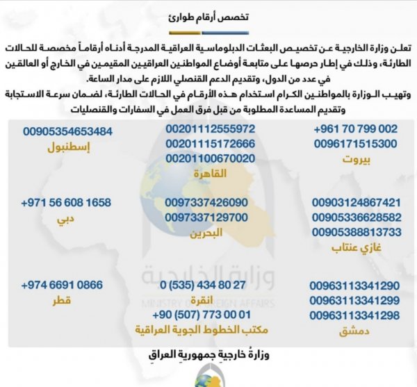 وطالبت المواطنين بـ"استخدام أرقام الطوارئ الخاصة بالسفارات والقنصليات العراقية، حيث تعمل فرق العمل بشكل متواصل على تقديم الدعم اللازم في الحالات الطارئة".![]()