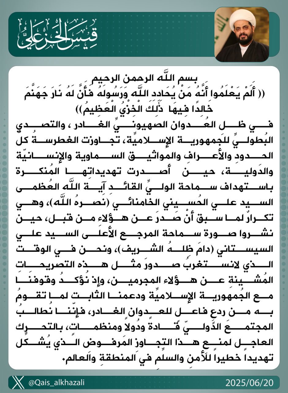 وذكر الخزعلي في ببان، تلقت "تنوع نيوز" نسخة منه :