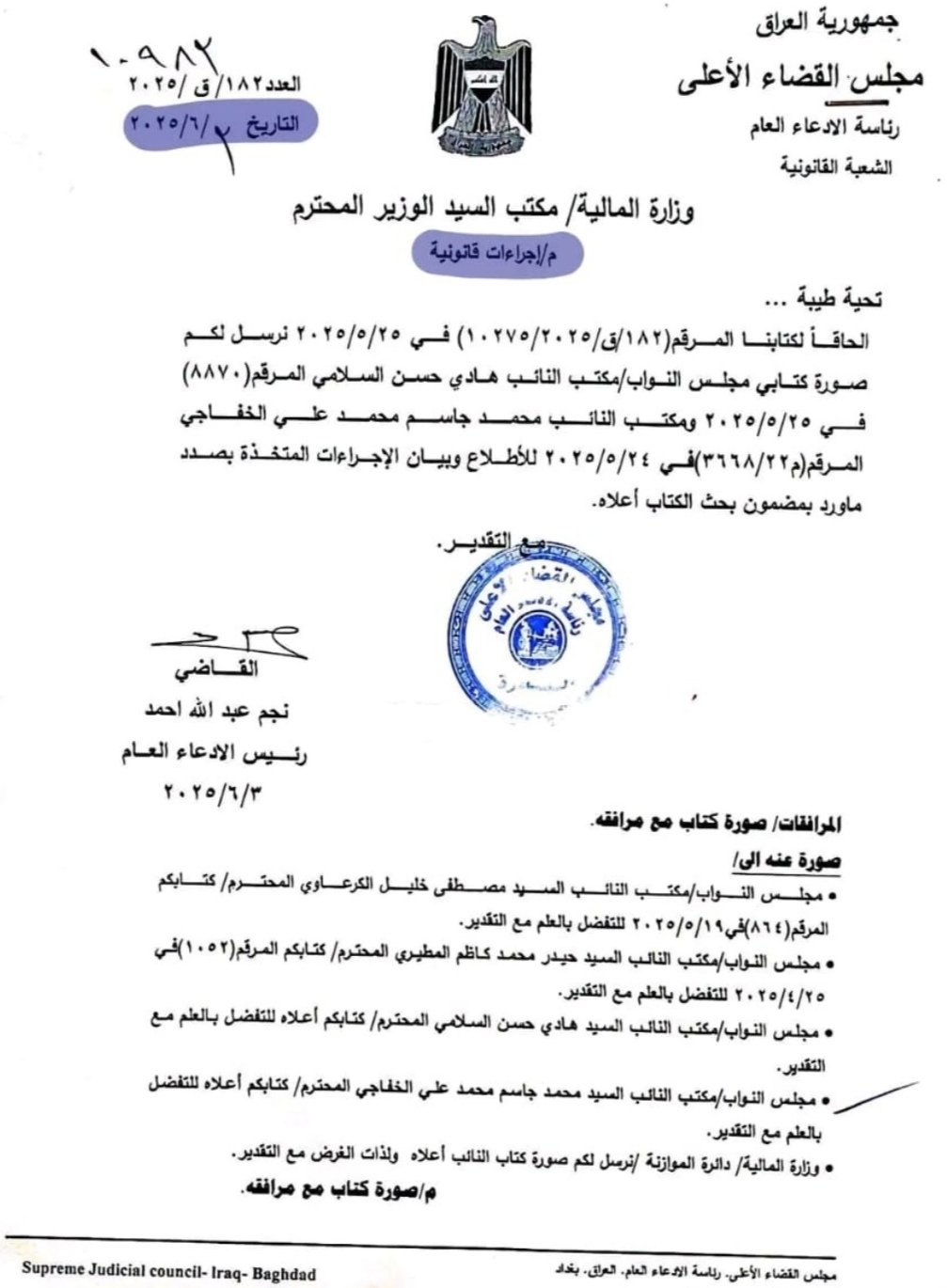 الادعاء العام وبحسب وثيقة صادرة عن مجلس القضاء الأعلى حصلت عليها "تنوع نيوز" ، اليوم الأحد وجه وزارة المالية ببيان اجراءاتهم الأصولية بشأن توقف الترفيعات والعلاوات دون سند قانوني".