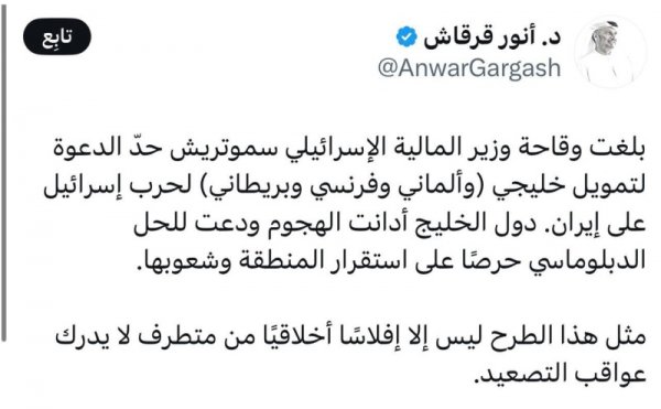 وقال قرقاش بتغريدة على منصة "اكس"، تابعتها "تنوع نيوز" ، إنه "بلغت وقاحة وزير المالية الإسرائيلي سموتريش حد الدعوة لتمويل (خليجي وألماني وفرنسي وبريطاني) لحرب إسرائيل على إيران".