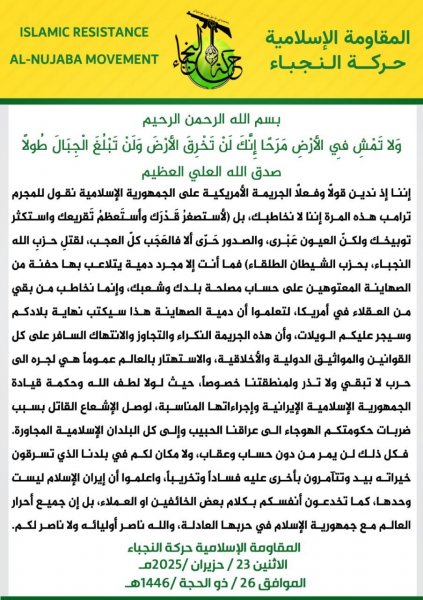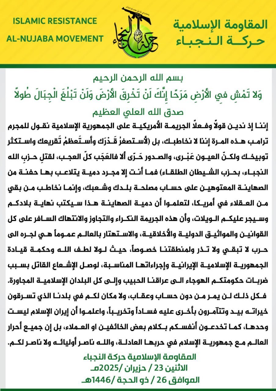 قالت حركة النجباء، اليوم الاثنين، بإن “إيران الإسلام ليست وحدها بل جميع أحرار العالم معها”
