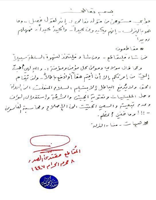 وبحسب الوثيقة ادناه والتي وردت لـ"تنوع نيوز"، فأن الصدر وجه انصاره بخيار المقاطعة مؤكدا، أن "من شاء فليقاطع"، مذيلا الوثيقة بتوقيع "المقاطع مقتدى الصدر".