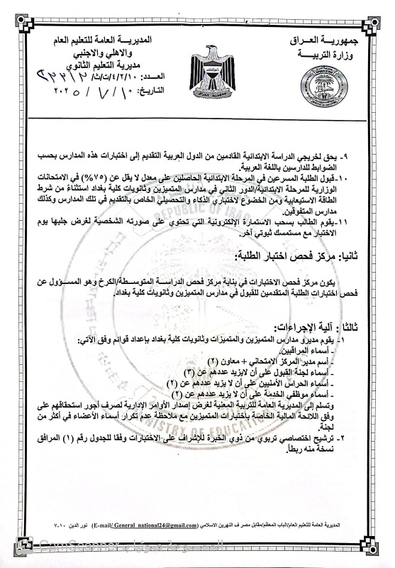 لا يقل مجموع الطالب الراغب بالتقديم الى مدارس المتميزين وثانويات كلية بغداد عن (582) درجة بالنسبة للطلبة المسلمين أي بمعدل (97%) و (485) درجة بالنسبة للطلبة غير المسلمين أي بمعدل 97٪،على أن يكون تقديم طلبة سهل نينوى / الحمدانية الديانة المسيحية التابعة الى المديرية العامة للتربية في محافظة نينوى على وفق الآلية نفسها للطلبة المسلمين.