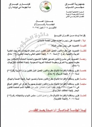 وأضافت ان “الجلسة تتضمن ايضا التصويت على مقترح قانون التعديل الأول لقانون أسس تعادل الشهادات والدرجات العلمية العربية والأجنبية رقم (20) لسنة 2020، وكذلك التصويت على مشروع قانون تصديق اتفاقية التشجيع والحماية المتبادلة للاستثمار بين حكومة جمهورية العراق وحكومة المملكة العربية السعودية “.