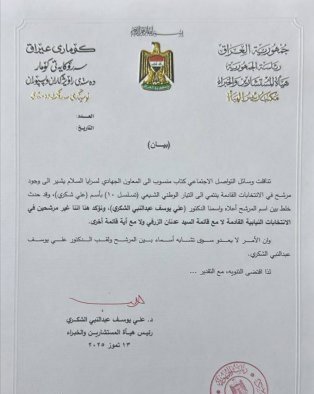 نفت رئاسة الجمهورية، اليوم الأحد، ترشّح رئيس هيئة المستشارين والخبراء علي يوسف عبد النبي الشكري للانتخابات النيابية المقبلة.