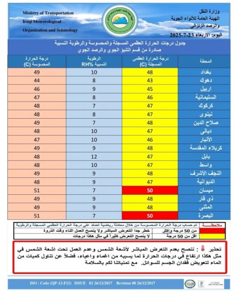 ونصح التقرير الجوي المواطنين "بعدم التعرض المباشر لأشعة الشمس وعدم العمل في مثل هذا الارتفاع بدرجات الحرارة لما يسببه من إغماء وإعياء، فضلاً عن تناول كميات من الماء لتعويض فقدان الجسم للسوائل"![]()
