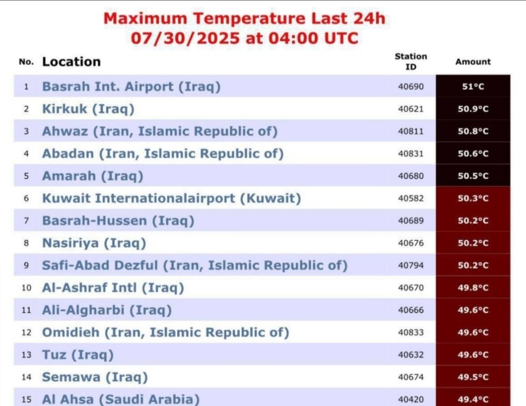 وبحسب وثيقة وردت إلى "تنوع نيوز"، فإن "المدن العراقية، وعلى رأسها مطار البصرة الدولي الواقع في محافظة البصرة جنوب البلاد تصدر لائحة الأعلى بدرجات الحرارة بدرجة 51 درجة سيليزية، إضافة الى مدن جنوبية أخرى مثل العمارة وعلي الغربي والناصرية وكركوك".